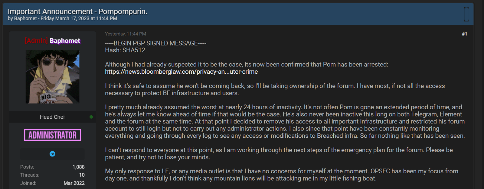 The BreachForums hacking forum was launched in 2022 after the law enforcement authorities seized RaidForums as a result of Operation TOURNIQUET. pompompurin always declared that he was ‘not affiliated with RaidForums in any capacity.’
