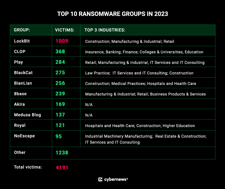 [ad_1] Ransomware attacks break records in 2023: the number of victims rose by 128% Pierluigi Paganini January 19, 2024 Ransomware groups claimed that they successfully targeted 4191 victims in 2023, Cybernews researchers report. According to the Ransomlooker tool, the number of ransomware attack victims increased... Continue reading