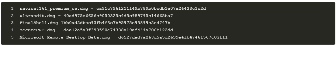 The malware-laced DMG files include legitimate software like Navicat Premium, UltraEdit, FinalShell, SecureCRT, and Microsoft Remote Desktop.