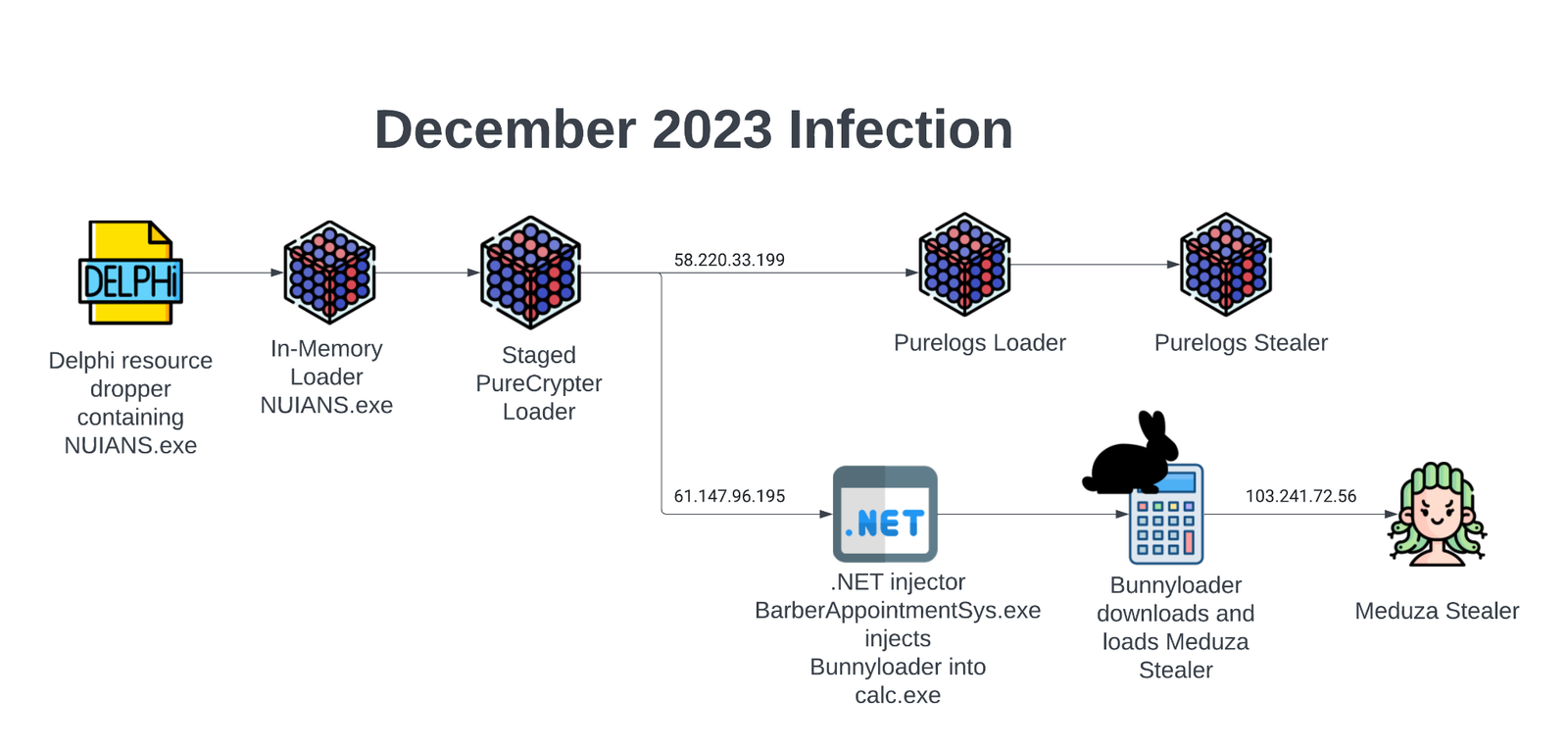 In one branch the PureLogs loader is executed to deliver the PureLogs stealer, while in the second attack pattern the BunnyLoader is dropped and used to execute the Meduza stealer.