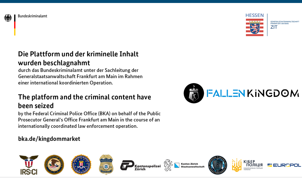 The Federal Criminal Police Office in Germany (BKA) and the internet-crime combating unit of Frankfurt (ZIT), along with law enforcement agencies from multiple countries (United States, Switzerland, Moldova, and Ukraine), conducted an operation that resulted in the seizure of the dark web marketplace Kingdom Market.