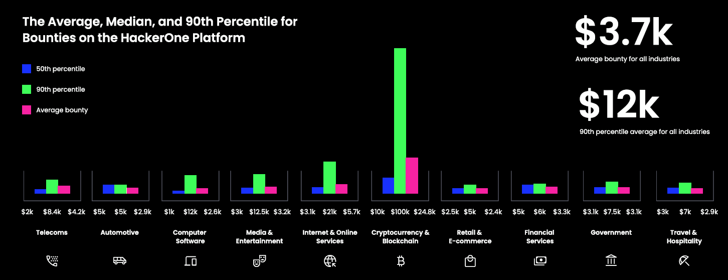 Crypto and blockchain organizations continue to offer the highest average overall payouts for vulnerabilities in their platforms, this year’s top reward was $100,050.