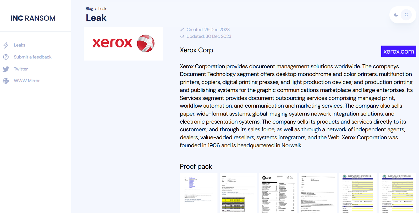 INC RANSOM ransomware gang claims to have breached Xerox Corp