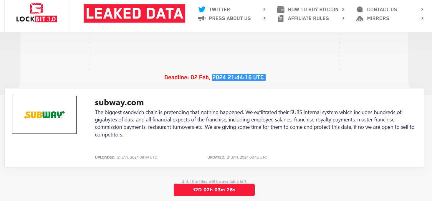 The Lockbit ransomware group added Subway to the list of victims on its Tor data leak site and threatened to leak the stolen data on February 02, 2024 at 21:44:16 UTC. The group claims to have stolen hundreds of gigabytes of sensitive data. The gang said that stolen data includes employee salaries, franchise royalty payments, master franchise commission payments, restaurant turnovers, and more
