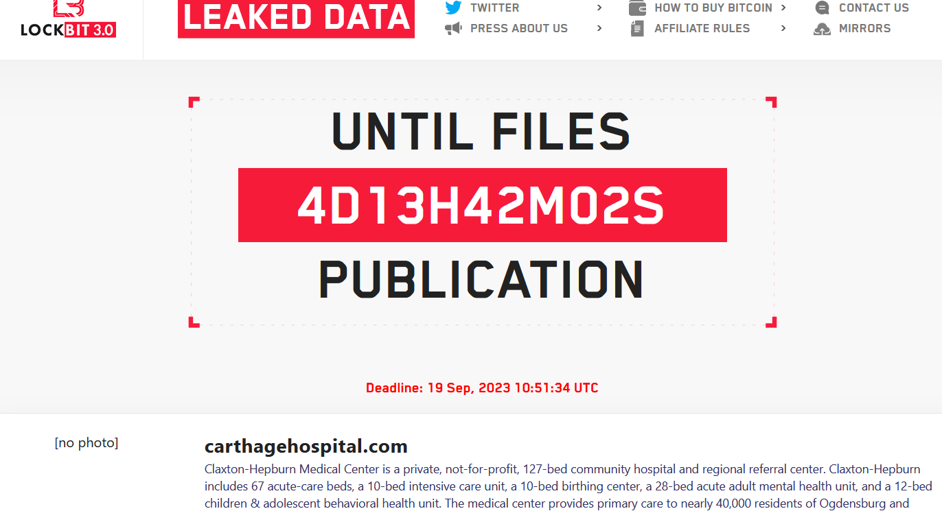 The Lockbit ransomware group claims to have hacked two major hospitals, the Carthage Area Hospital and Claxton-Hepburn Medical Center. The two hospitals serve hundreds of thousands of people in upstate New York.