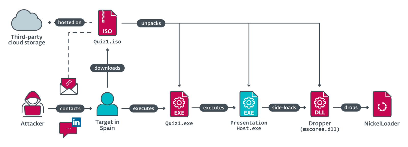 The attack chain leads to the deployment of an HTTP(S) downloader, named NickelLoader, to the victim’s computer. Then the downloader is used to deploy additional malicious payloads into the memory of the victim’s system, including the LightlessCan RAT and miniBlindingCan that is a simplified version of the BlindingCan RAT.