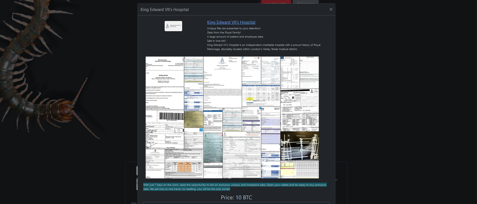 The Rhysida ransomware group claimed to have hacked King Edward VII’s Hospital in London.