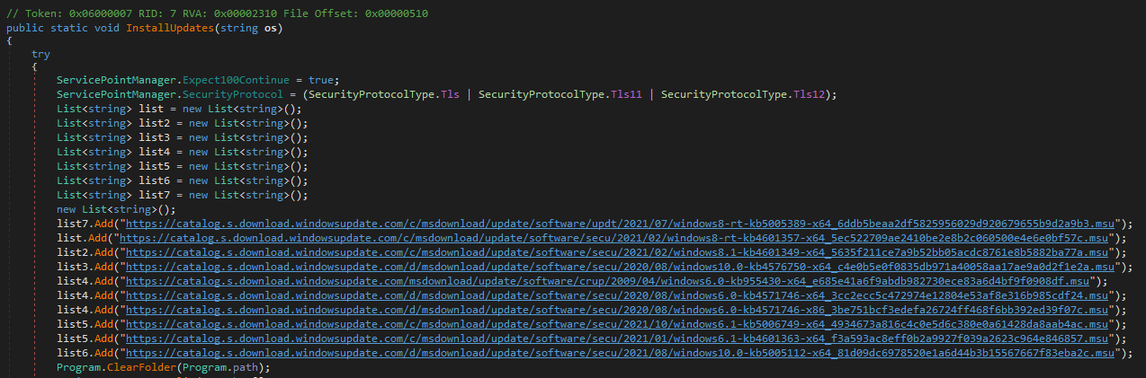 On several occasions, ESET telemetry has shown Spacecolon operators executing a custom .NET payload that we will refer to here as ScPatcher. ScPatcher is designed to do nothing malicious. On the contrary: it installs chosen Windows Updates. The list of updates installed is illustrated in Table 1 and the corresponding code part of ScPatcher in Figure 1.